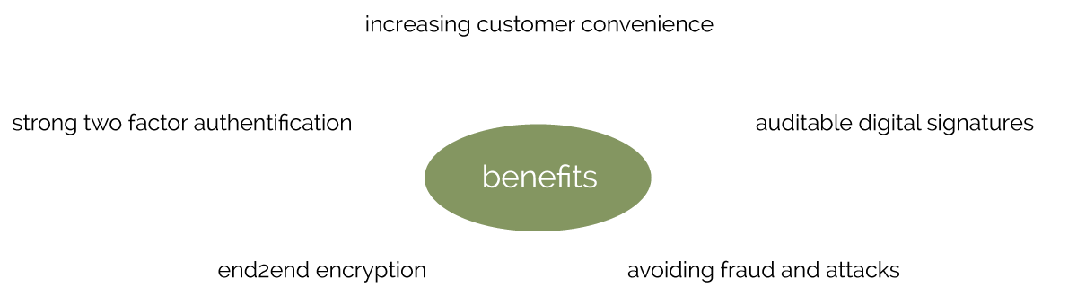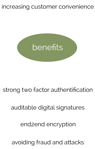 Fast & easy integration into existing infrastructuresStraightforward integration to existing workflows by reuse of existing components and platforms using the Seal One API provided to the partner. Any kind of transaction types are supported (account transfer, change of address, product selling, ...)